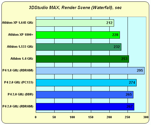 Разве что интересен результат сравнения Athlon 1533 MHz vs. Athlon XP 1800+. Поскольку ни о какой оптимизации механизма рендеринга 3DStudio MAX под SSE нам неизвестно, выигрыш последнего может быть объяснен исключительно другими факторами: теми самыми пресловутыми Hardware Prefetch и новым TLB. И что? Конечно, нельзя делать выводы по одному-единственному приложению, но пока мы вынуждены констатировать, что не очень впечатляет…