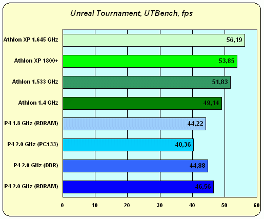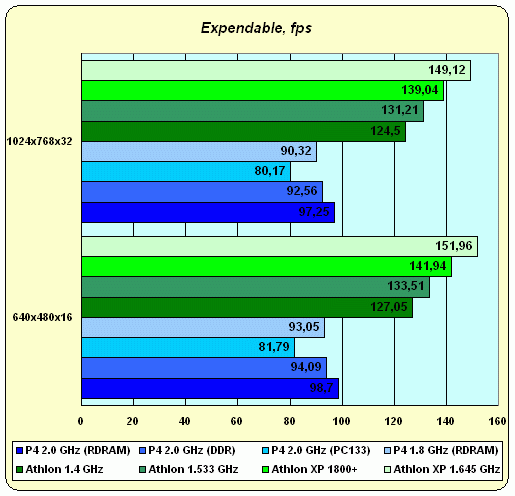 Как ни странно, если присмотреться, то можно заметить, что результаты Unreal Tournaments и Expendable… очень похожи! Нужно только немного отвлечься от цифр, и представить себе обе диаграммы рядом именно в графическом виде. Понятно, что в Expendable Pentium 4 стабильно проигрывает процессорам старой архитектуры за счет "хаотичного" кода приложения, но если поделить результаты Expendable на некий коэффициент, то мы получим результаты Unreal Tournament. Вывод? Оба приложения, видимо, относятся к "неудобным" для Pentium 4, просто в разной степени: Expendable — чуть больше, Unreal Tournament — чуть меньше.