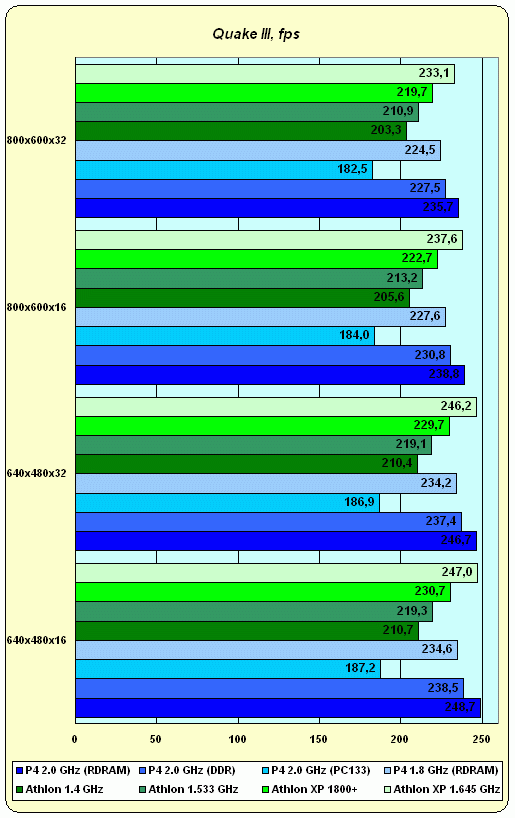 А вот тут гораздо более четко видна разница между: а) системами, оснащенными разным типом памяти; и б) ядром Thunderbird и Palomino. PC133 явно "тормозит" Pentium 4, причем очень существенно. Также забавно, что Pentium 4 1.8 GHz + RDRAM оказывается все-таки быстрее Pentium 4 2.0 GHz + PC2100 DDR на VIA P4X266. Впрочем, мы еще не видели плат на этом чипсете от признанных грандов индустрии…
