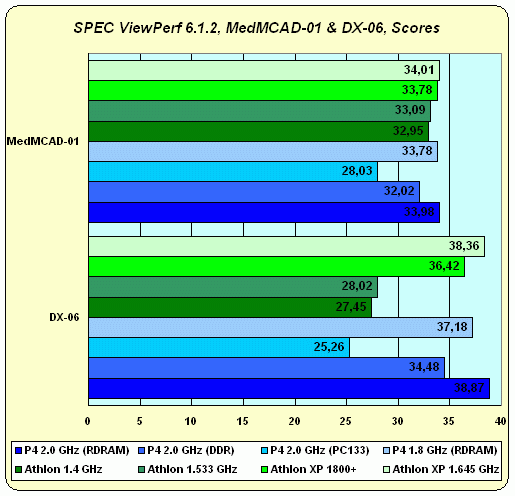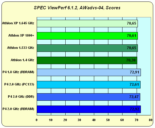 Довольно странная картина: AWadvs-04 (Alias|Wavefront Advanced Visualizer) нами традиционно считался тестом на скорость текстурирования т.е. по большому счету задача процессора в нем сводится к тому, чтобы не мешать видеокарте максимально проявить себя. С одной стороны, результаты тестов это подтверждают — видно, что процессоры с разной частотой демонстрируют практически одинаковую скорость. Но почему-то у Athlon эта одинаковая скорость стабильно чуть-чуть меньше, причем даже меньше чем у Pentium 4 + PC133. Возможных причин нам видится только две: либо у Intel чуть получше AGP, либо (и это все же вероятнее) сказалась "заточка" драйверов Detonator под SSE2. Выбор, как говорится, небогатый, и, увы, со 100% уверенностью проверить что первое что второе утверждение не представляется возможным.