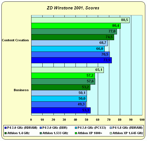 Про "любовь" тестов от eTestingLabs к процессорам AMD мы уже писали не раз, писали и о том, чем это вызвано — ориентацией используемых в них приложений на "старую" (отнюдь не стоит понимать это слово как "худшую"!) архитектуру и малым количеством оптимизированных под SSE2 программ. Не подвел Winstone любимый процессор и в этот раз: полный и безоговорочный выигрыш Athlon XP.