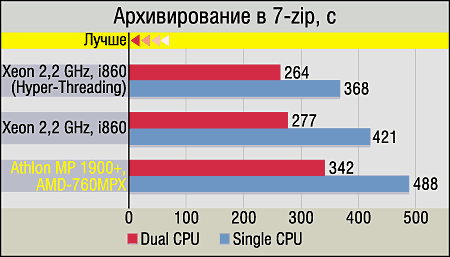 Новый тест с применением архиватора 7-zip, поддерживающего многопроцессорность и реально умеющего ее использовать "по назначению", также предпочитает Intel Xeon (причем, судя по всему, именно в этой программе какая-либо специальная оптимизация под специфические наборы команд различных CPU вообще отсутствует). Кстати, 7-zip — одно из немногих приложений, где польза от включения Hyper-Threading видна невооруженным глазом.