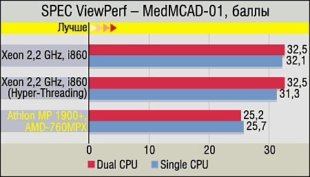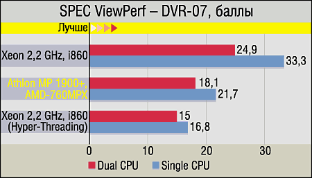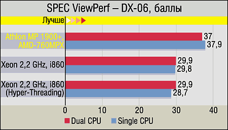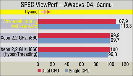 SPEC ViewPerf, который в наших тестах олицетворяет собой профессиональный OpenGL, никаких сюрпризов не преподнес: как и всегда, производительность двухпроцессорных систем ниже, чем у однопроцессорных, причем если настоящий SMP и так снижает результаты довольно сильно, то "эмуляционный" (Hyper-Threading) — еще сильнее (об этом мы детально писали в онлайновой версии статьи по Hyper-Threading). Пожалуй, отдельного внимания заслуживают только два факта: убедительная победа Athlon-систем в тесте AWdavs-04 (что несколько странно, ибо основная нагрузка именно в данном случае ложится на TMU видеокарты) и то, что снижение производительности при добавлении второго процессора у них также ощутимо меньше, чем в случае с Xeon (даже при отключенном Hyper-Threading). Гадать о причинах последнего явления можно долго, но почему-то постоянно вспоминается одно из основных отличий SMP от AMD и Intel — в первом случае присутствуют две процессорные шины, по одной на каждый CPU, а во втором — одна шина, которую процессоры делят между собой.
