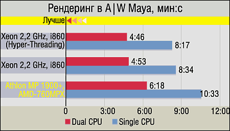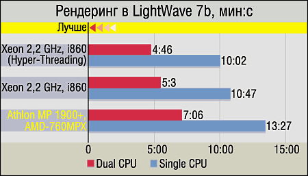 Итак, практически все программы трехмерного моделирования (3D Studio MAX, LightWave, A|W Maya), в принципе, "единодушны" — лидируют системы на базе Intel Xeon. Однако в деталях небольшие различия есть. Так, выигрыш Xeon в 3D Studio MAX можно считать чисто номинальным — только системы с включенным Hyper-Threading обгоняют аналогичные по количеству процессоров платформы AMD, да и то незначительно. Воистину "разгромными" для платформы AMD являются только результаты LightWave 7b, но если вспомнить тот факт, что NewTek чуть ли не "персонально посвятила" выпуск седьмой версии LightWave процессору Intel Pentium 4, то все становится на свои места. Впрочем, A|W Maya также в большей степени "симпатизирует" Xeon, хотя эту программу, насколько нам известно, разработчики ни под какие процессоры особо не оптимизировали.