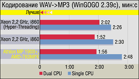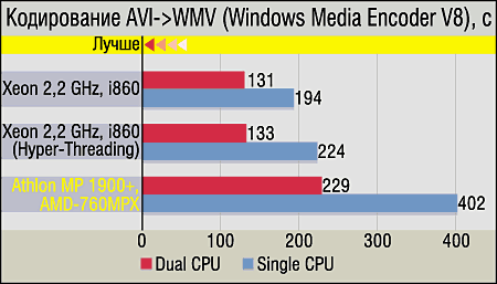 Тесты на кодирование WAV в MP3 и AVI в WMV (Windows Media Video V8) особых сюрпризов также не принесли — Pentium 4 всегда был силен в потоковых операциях, и Xeon унаследовал от своего "родителя" эту особенность. Однако проигрыш Athlon MP вовсе не так велик, как этого можно было бы ожидать, учитывая разницу между процессорами--конкурентами по частоте. К слову, о кодировании видеоряда. Мы не зря перешли с DivX на использование Windows Media 8 Encoding Utility. Во-первых, нас довольно сильно разочаровал новый "оптимизированный под процессоры AMD" кодек DivX 5.0. Его "оптимизация" в некотором роде действительно "абсолютна" — процесс кодирования с помощью DivX 5.0 + VirtualDub 1.4.9 на Xeon-системах нам довести до конца ни разу так и не удалось: программа завершала выполнение с сообщением об ошибке. К тому же DivX практически не поддерживает многопоточность, а WM 8 Encoding Utility, как легко заметить, получает от второго процессора чуть ли не двукратное ускорение, совершенно бесплатно доступна для загрузки с сайта Microsoft и имеет очень "скромный" по нынешним временам размер дистрибутива — всего 620 KB.