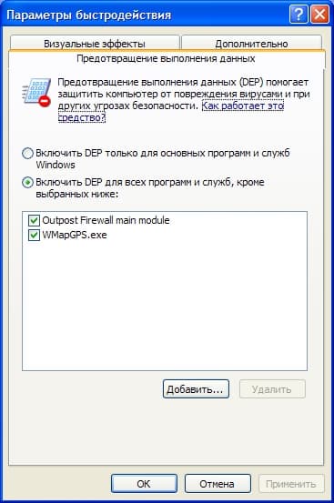 Ниже выбирать ничего не надо, система сама предложит добавить такие программы (файрволлы, антивирусы и т. п.) в список впоследствии при их первом «вылете» при срабатывании защиты. Не исключено, конечно, что какие-либо из ваших программ, в которых исполнение кода из области данных используется в мирных целях, как прием программирования (пусть не вполне корректный, но допустимый), не смогут быть корректно «обработаны» Windows и будут вылетать безо всякого предупреждения от системы защиты. Их придется добавить в список самостоятельно (и, таким образом, им по-прежнему будет разрешено исполнять код из области данных). Или, что лучше, предварительно справиться, не решена ли эта проблема более естественным образом (выпуском патча или новой версии самой программы).
