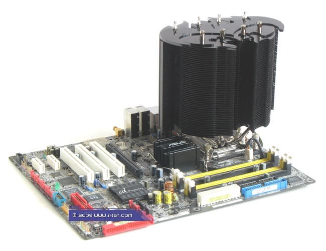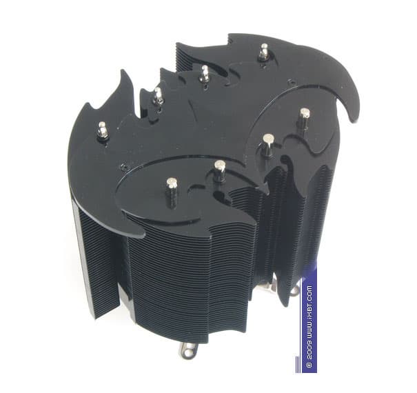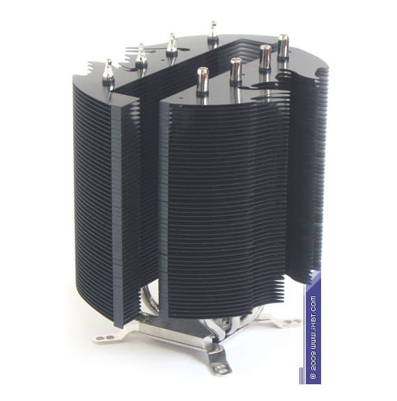 Конструктивные особенности (радиатор). «Рабочее тело» кулера образовано комбинацией медного теплосъемника 38х40х5 мм, 4 медных тепловых трубок диаметра 6 мм и 2 секций алюминиевого оребрения (50 пластин в каждой секции, общая площадь поверхности теплообмена порядка 8500 см2).