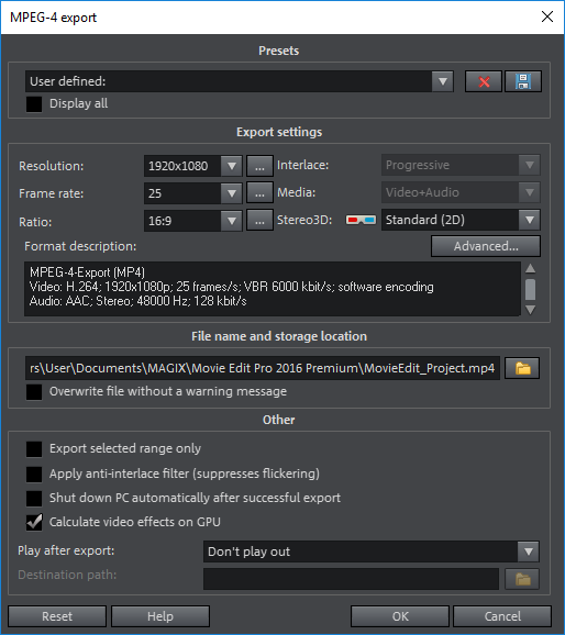 В тесте с использованием приложения Magix Movie Edit Pro 2016 Premium v.15.0.0.102 создается видеоролик из шести видеофрагментов суммарным объемом 1043 МБ. Видеофрагменты (контейнер MOV) сняты камерой Canon EOS Mark II 5D с разрешением 1920×1080 и частотой кадров 25 fps. Экспорт производится с использованием кодека H.264 (пресет MPEG-4 export). В настройках экспорта проекта можно указать, чтобы расчет видеоэффектов производился на GPU (Calculate Video Effects on GPU). Но поскольку никаких специальных видеоэффектов мы в нашем проекте не накладывали, ожидать, что активация данной опции приведет к сокращению времени выполнения теста, не приходится. И действительно, при активации данной опции результаты не меняются.