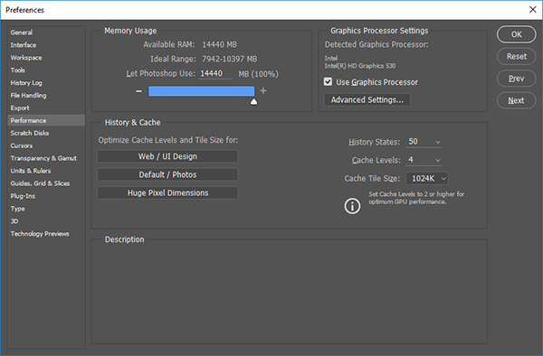 Для референсной системы на базе процессора Intel Core i7-6700K в тесте на основе приложения Adobe Photoshop CС 2015.5 мы получаем результат при использовании графического ядра Intel HD Graphics 530 c настройками по умолчанию («Использовать графический процессор для ускорения вычисления», «Использовать OpenCL»). Собственно, так было и раньше, в этом плане ничего не изменилось.