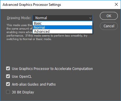 Однако при использовании GPU есть ряд дополнительных настроек, о которых имеет смысл упомянуть. Прежде всего, это режим рисования (базовый (Base), обычный (Normal) или расширенный (Advanced)), а также такие опции, как: