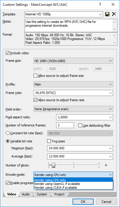 Мы проверили на нашем референсном стенде (использование графического ядра процессора Intel Core i7-6700K) и на ноутбуке с дискретной графикой Nvidia GeForce GTX 1050 Ti. В обоих случаях опции «Render using OpenCL if available» и «Render using CUDA if available» не позволяют ускорить время рендеринга в сравнении с опцией по умолчанию («Render using CPU only»). Соответственно, данный тест мы будет проводить как и ранее, то есть с настройками пресета MainConcept AVC/AAC (Internet HD 1080p) по умолчанию («Render using CPU only»).