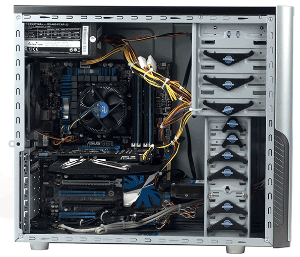 Качество сборки системы достаточно хорошо видно на фотографии: никакие кабели не провисают, всё аккуратно закреплено с помощью стяжек, ничто даже теоретически, при самой сильной тряске, не может помешать вентиляторам кулеров свободно вращаться. Впрочем, не будем забывать, что на дворе у нас 2011 год, и все эти приёмы давно освоены практически всеми сборщиками — никто сегодня в грязном подвале стамесками винты не заворачивает, эти страшилки можно смело забывать (по крайней мере, если вы доверились современной компании, а не патлатому панку-сисадмину, начавшему карьеру ещё в 90-е). Так что качество сборки Team Computers мы можем смело назвать отличным — и так же смело констатировать, что оно сейчас такое практически у всех крупных игроков данного рынка.