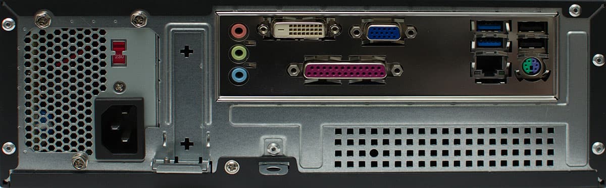 Задняя панель не балует количеством разъёмов. Тем не менее, мы видим даже 2 USB 3.0. Зачем они офисному компьютеру — сие пока тайна великая есть, однако лишний запас, как говорится, карман не тянет. А вот общего количества разъёмов USB, уже неважно 2.0 или 3.0 — конечно, хотелось бы побольше. Главное, что есть DVI — без него современный компьютер сложно себе представить. LPT... странно, конечно, видеть его в 2012 году, но, опять-таки, вряд ли он кому-то помешает. Хотя, конечно, логиченне было бы вместо LPT ещё хотя бы парочку USB 2.0 поставить.