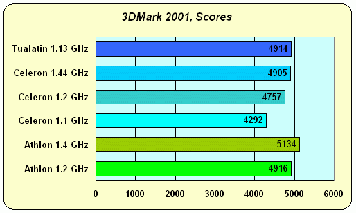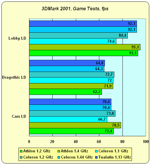 Что интересно — картина полностью повторяет тесты Lobby и Cars из бенчмарка 3DMark 2001, причем это настолько бросается в глаза, что просто нельзя не заметить. Одинаковые по архитектуре Celeron и Pentium III Tualatin окончательно расставляют все по местам — да, с ростом частоты у Celeron растет и производительность, но 100 MHz FSB + 128 KB L2 cache "делают свое черное дело", и гораздо более экономичным решением оказывается 133 MHz FSB + 256 KB L2 у Tualatin. Под "экономичным" мы при этом подразумеваем не столько материальный аспект, сколько технологический — можно предположить, что простое введение поддержки 133 MHz FSB в линейку Celeron могло бы привести к гораздо большим результатам по производительности нежели экстенсивный путь — наращивание мегагерц работы ядра. Это было бы, так сказать, более изящным решением :)