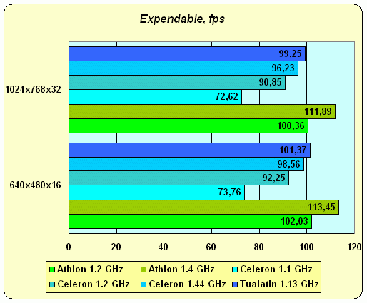 Мы не стали уделять повышенного внимания описанию и трактовке результатов этих тестов, но для справки приводим и их диаграммы (а чего добру пропадать — оттестировали же! :). В общем и целом картина стандартна для описанных выше игр. Тест на латентность (ахиллесова пята, которую здорово выпячивает Expendable) все системы "откатали" без нареканий, что и не удивительно — "падучей" под Expendable страдает только связка из Pentium 4 + RDRAM из-за особенностей аппаратной реализации последней, здесь же все системы работали с SDRAM, а DDR или SDR — в данном случае не суть важно.
