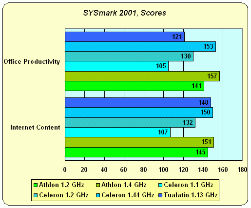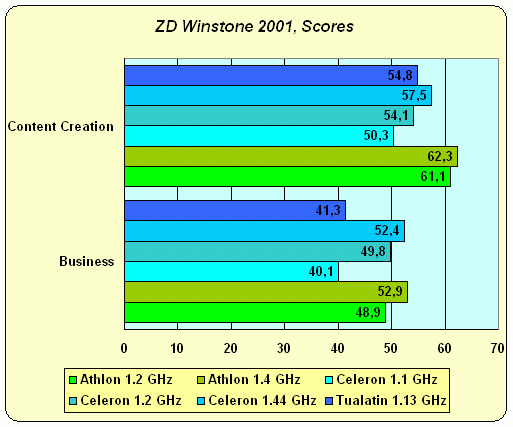 Бенчмарк от ZD Labs (сейчас уже eTesting Labs) "предпочитает" всем процессорам CPU от AMD, это уже не секрет. Однако не стоит обвинять именитую компанию в подтасовке — это просто-напросто обусловлено тем, какие приложения используются в этом тесте. Ведь опять-таки не секрет, что ядро Athlon все-таки немного совершеннее с точки зрения привычной "пентиумной" архитектуры, чем ядро Pentium III / Celeron / Tualatin (хотя бы потому, что оно намного новее и AMD имела прекрасную возможность учесть все ошибки Intel). Приложений же, задействующих возможности Pentium 4, в Winstone 2001 практически нет. Впрочем, этого процессора в этом тестировании нет тоже :)