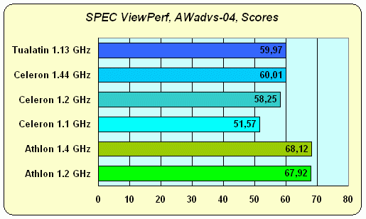 Разница между различными процессорами Intel видна, и Tualatin с его большим кэшем и 133 MHz FSB опять на высоте — он обгоняет даже Celeron 1.44 GHz. Да уж, совершенно четко видно, что для профессиональных приложений даже самый "навороченный" и высокочастотный Celeron мало подходит. Но, увы — даже Tualatin, видимо, "упирается" еще и в память, поэтому абсолютным чемпионом опять выходит Athlon.