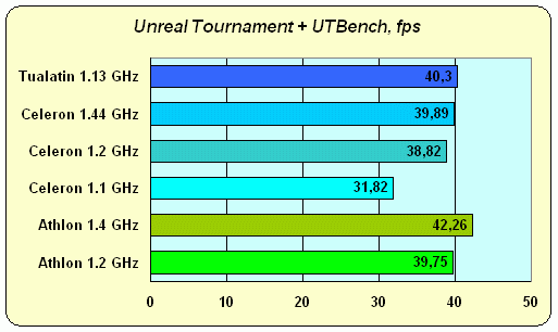 Тест в большей степени на скорость текстурирования, и четко видно, что начиная с определенной частоты, скорость процессора в нем уже не важна. А вот производительность подсистемы памяти дает о себе знать, и в данном случае — проигрышем всех процессоров Intel. Сюда бы Pentium 4 с его 3.2 GB/sec двухканальной RDRAM — вот он бы всем показал! :) Ну а Tualatin и Celeron, довольствующиеся PC133, можно сказать, "не виноваты" — их проигрыш обусловлен не производительностью самих процессоров, а использованием PC2100 DDR на системах с Athlon. Впрочем, поправимся — Athlon с его 266 MHz FSB еще и способен утилизовать такую память, чего CPU на ядре P6 сделать не могут — полоса пропускания их шины равна полосе пропускания именно PC133, и не более.