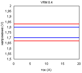 Где синим обозначен коридор Vcore для статической нагрузки, а красным — для резких изменений. Как вы видите, такое понятие как Vcore в VRM 8.5 практически исчезло! Значение напряжения питания ядра больше не является постоянным. Вместо этого предлагается построение так называемой нагрузочной прямой (Load Line), где выдаваемое VRM напряжение линейно зависит от потребляемого процессором тока. А выводы VID процессора теперь задают некоторое базовое значение Vcore, определяющее смещение коридоров по высоте. Как показали исследования Intel такое решение во первых легко реализуемо (даже на основе существующих микросхем управления VRM), а во вторых оно является более подходящим для ядра на основе технологии 0.13, чем постоянное напряжение питания.