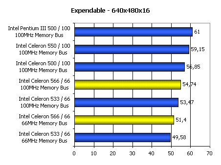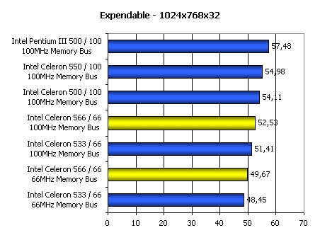 Производительность в Expendable сильно зависит от быстродействия подсистемы памяти. Именно поэтому мы видим, что Celeron 533, выполненный на старом ядре Mendocino, но работающий с памятью на 100 МГц легко опережает новый Celeron 566, если он работает с памятью при 66 МГц. Именно поэтому можно утверждать, что синхронные чипсеты, такие как i440BX/ZX, при использовании процессорной шины 66 МГц уже не могут обеспечить должного уровня производительности.