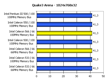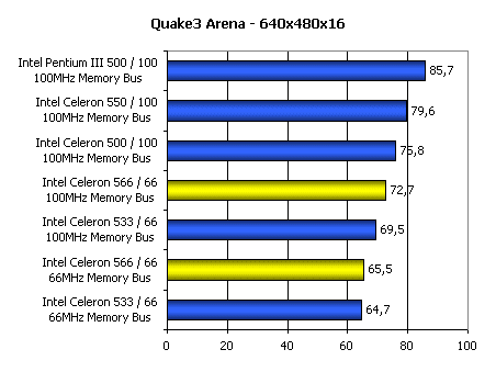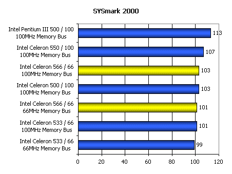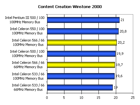 Результаты также сильно зависят от частоты, на которой работает системная память. Однако даже при использовании 100-мегагерцовой шины памяти Intel Celeron 566 еле-еле дотягивает до Celeron 333, разогнанного до 500 МГц повышением частоты FSB до 100 МГц.