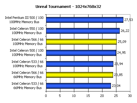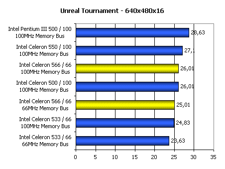 Эта диаграмма практически полностью повторяет предыдущую. Unreal Tournament — очень ресурсоемкая игра и производительность в ней складывается из многих составляющих. Тем не менее, она ясно показывает, что шина 66 МГц по современным меркам — очень серьезный тормоз.