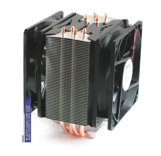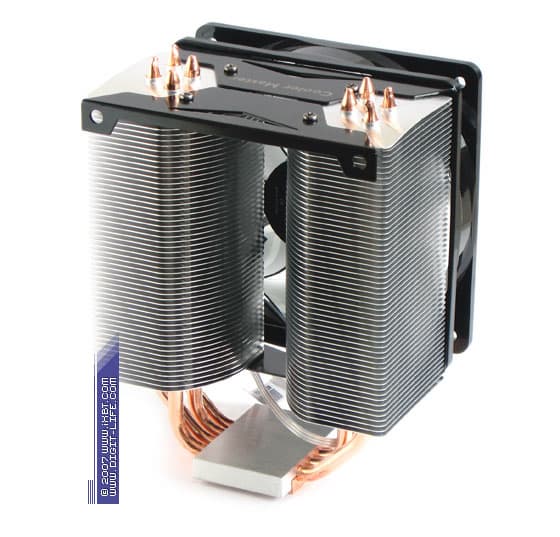 Отрадно, что наш подопытный не ограничивается признаками только лишь экстенсивного развития. Главной фишкой Hyper 212 является хитроумная и весьма оригинальная конфигурация оребрения: вместо типовой архитектуры, характерной для большинства «башенных» теплотрубных кулеров, то есть, «монолитной» секции пластин, тут мы наблюдаем разбиение на две фактически самостоятельных секции, каждая из которых взаимодействует со своими «личными» отводами тепловых трубок и насчитывает 55 закругленных пластин с характерными размерами 50х60 мм (шаг размещения 2 мм). Такой подход позволяет решить сразу две задачи — повысить термическую и гидравлическую эффективность оребрения (за счет усиленного продува и оптимизированного прогрева пластин), задействовав в теплообмен практически всю доступную поверхность теплосброса (порядка 5500 см2), и одновременно с этим рационализировать вес кулера (составляет 730 г).