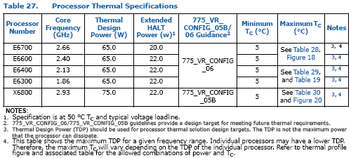 Как любит подчеркивать сама корпорация, в результате перехода на Core 2 старшие десктопные процессоры Intel стали, см., например, обзор, на 40% более быстрыми и на 40% более экономичными (читай — «холодными»). Если говорить скупыми цифрами официальных спецификаций, то TDP (типичное тепловыделение в активной работе) нынешних двухъядерных процессоров Intel Core 2 Duo с частотой от 1,86 до 2,67 ГГц составляет всего 65 ватт против более чем 100 ватт у старших моделей Pentium D. Если же брать топовые «экстремальные» процессоры, то Intel Core 2 Extreme X 6800 с частотой от 2,93 ГГц рассеивает «типично» 75 ватт, тогда как Pentium Extreme Edition 965, 955 и 840 имеют TDP в 130 ватт (реально измеренные значения энергопотребления этих процессоров при интенсивной нагрузке в специальных программах еще на несколько десятков ватт выше).