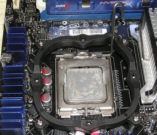 Крепление кулера на плату осуществляется тем же способом, что и у 9500-х (весь крепеж фактически взаимозаменяем): специальная пружинящая металлическая скоба прижимает центр основания кулера,