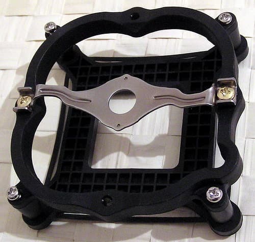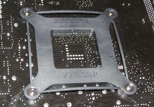 либо к двум отверстиям на плате с процессором AMD, либо к пластиковой рамке для LGA775, которая крепится с обратной стороны платы на контр-рамку четырьмя винтами по стандартному квадрату.