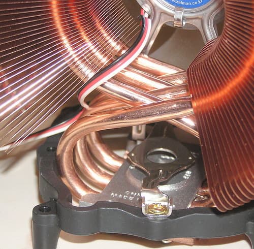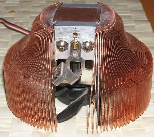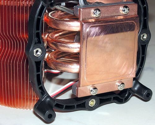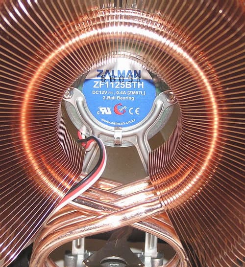 Диаметр радиатора 9700-го возрос с 11 до 13 см, длина увеличилась где-то на сантиметр, высота — сантиметра на два, да и тепловые трубки стали чуть толще. По-прежнему, секция медных пластин толщиной 0,2 мм образует хорошо продуваемый радиальный «веер» с большой площадью поверхности теплообмена (5490 кв.см, что почти в полтора раза больше, чем у 9500-х), причем интенсивно работает практически вся эта поверхность — как в центре («кольца» термоконтакта с трубками), так и на внешнем радиусе.