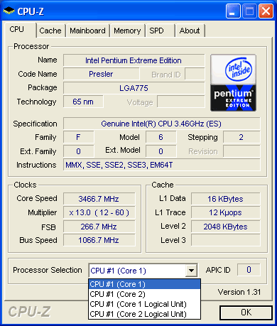 Тесты теплоотдачи проводились на материнской плате Intel D975XBX на чипсете Intel 975X Express с процессором Intel Pentium Extreme Edition 955 на 65-нм ядре Presler (системная шина с частотой 1067 МГц). Напомню, что каждое из двух фактически независимых ядер этого процессора оснащено технологией Hyper-Threading, то есть один физический процессор видится в системе (и работает, если может ;)) как четыре логических.
