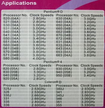 Предназначен он для всевозможных процессоров Intel с разъемом LGA775, причем их полный перечень с обозначением теплового конверта (точнее — варианта совместимости платформ от 04А до 05B) приведен прямо на коробке: