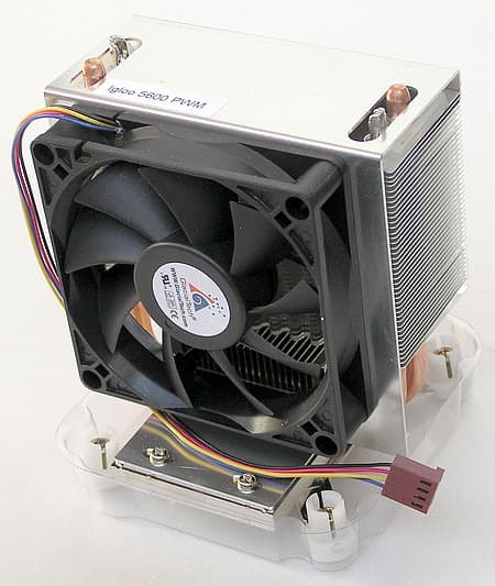 1. Кулер GlacialTech Igloo 5600 PWM на тепловых трубках (см. таблицу выше), имеющий полностью алюминиевый, но с массивным основанием радиатор и высокоскоростной вентилятор.