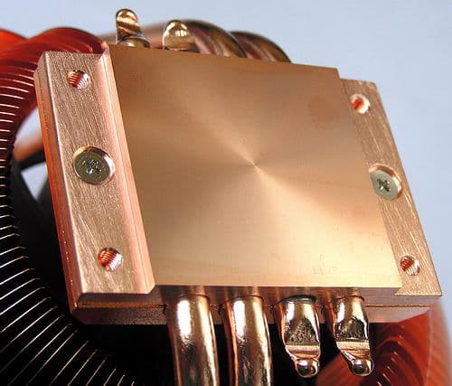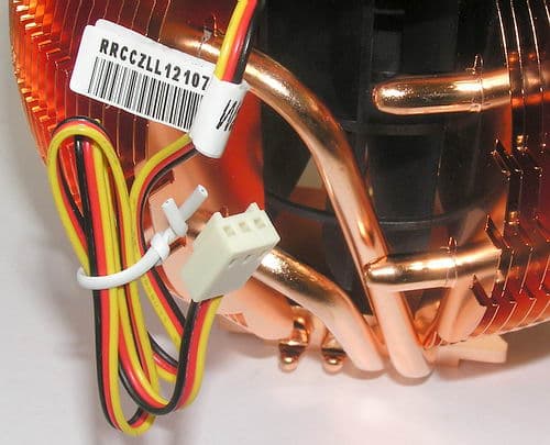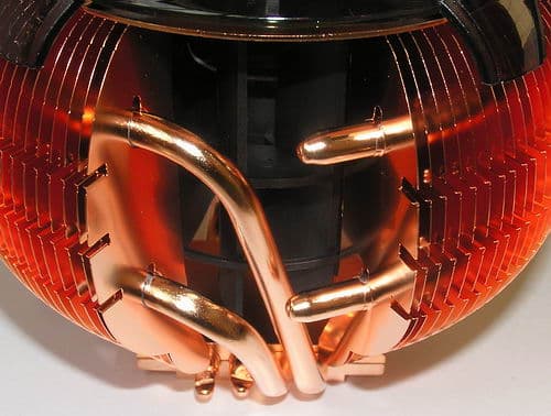 Во-вторых, это тепловые трубки и их контакт с радиатором. Если у Mars их было три, причем они всего лишь соединяли между собой верхнюю и нижнюю «стяжки» ребер, не касаясь при этом ребер «по периметру» (отсюда и скромная теплоотдача Mars), то наши тогдашние сетования на недостатки такой конструкции, возможно, были услышаны, и в конструкции Sphere уже 4 трубки диаметром 6 мм, причем каждая пара пронизывает одно из полушарий радиатора, прикрепляясь к каждому из ребер не только обжимом, но и при помощи термоклея. На одном конце эти термотрубки зажаты меж двух половинок сантиметрового по толщине медного основания кулера.