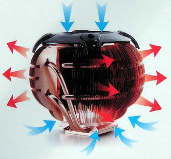Трехпроводный вентилятор кулера Sphere — турбинного типа (цилиндрическая крыльчатка) высотой 68 мм и диаметром 66 мм. Модель B10478-22BB-3CN-L1 с максимальным током потребления 400 мА использует долговечные подшипники качения с ресурсом 40 тыс. часов (как и у Mars), скоростью вращения 2200 об./мин. (у нас на тесте был вариант со скоростью 2500 об./мин.) при питании от +12 В и декларируемым уровнем шума 22 дБА (по нашим измерениями получается ощутимо выше). На мой взгляд, такое решение явно лучше, чем было у Mars (обычный вентилятор, «убранный» внутрь радиатора). Как вы знаете, «турбинный» вентилятор имеет свои особенности циркуляции воздуха — выброс потока преимущественно по бокам цилиндра, забор воздуха сверху и снизу кулера. И производитель приводит наглядную картинку, где это показано.