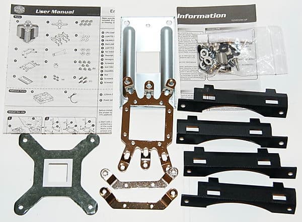 В большой непрозрачной картонной коробке с информативными надписями по бокам кроме самого кулера находятся бумажный мануал, CD с «дровишками» и полезным софтом (шутка, конечно, хотя за такую цену могли б и добавить специализированных утилиток), минитюбик с термопастой Supreme Thermal Compound серого цвета почти жидкой консистенции, скобы для установки навесных вентиляторов и полный комплект винтовых креплений кулера к плате.