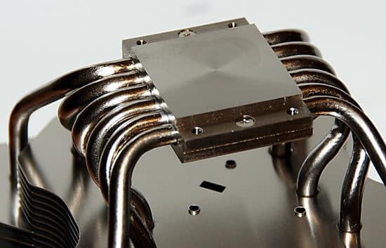 Аж шесть длинных медных тепловых трубок диаметром 6 мм пронизывают радиатор с двух сторон, а по центру зажаты в медном основании суммарной толщиной 11 мм. Основание отполировано почти до зеркального блеска.