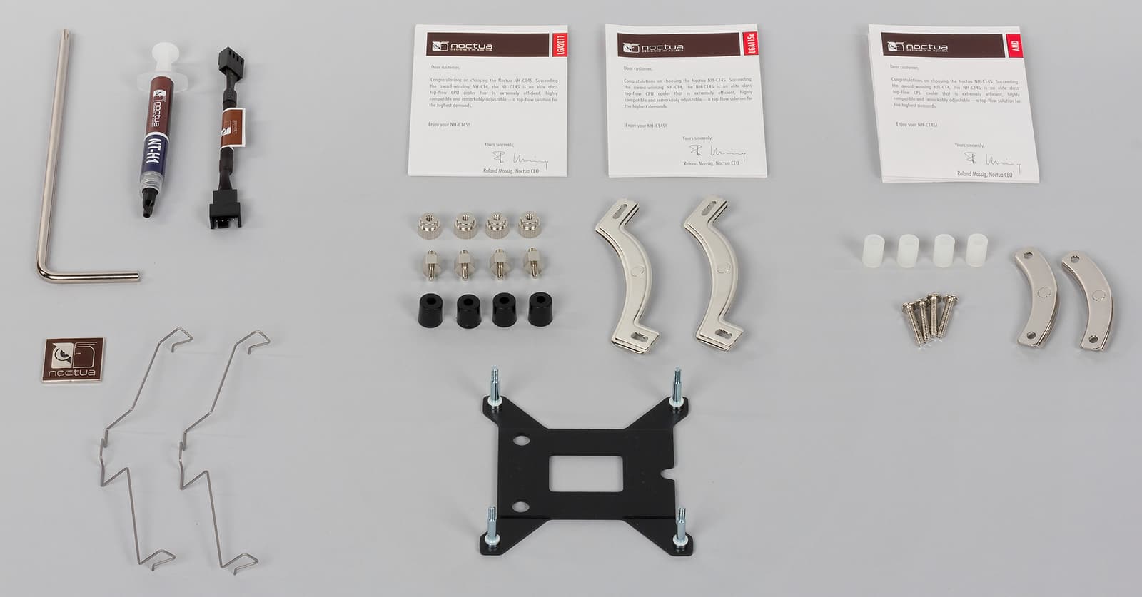 Комплект поставки почти так же богат, как и в случае Noctua NH-L12. Здесь есть всё для установки модели на процессорные разъемы AMD и Intel, переходник Low-Noise Adaptor, понижающий обороты вентилятора, фирменная термопаста, шильдик Noctua и Г-образная крестовая отвертка. Помимо основного набора, в комплекте присутствуют дополнительные скобы для крепления опционального вентилятора. Отметим, что предыдущая модель Noctua NH-C14 поставлялась с двумя одинаковыми вентиляторами.