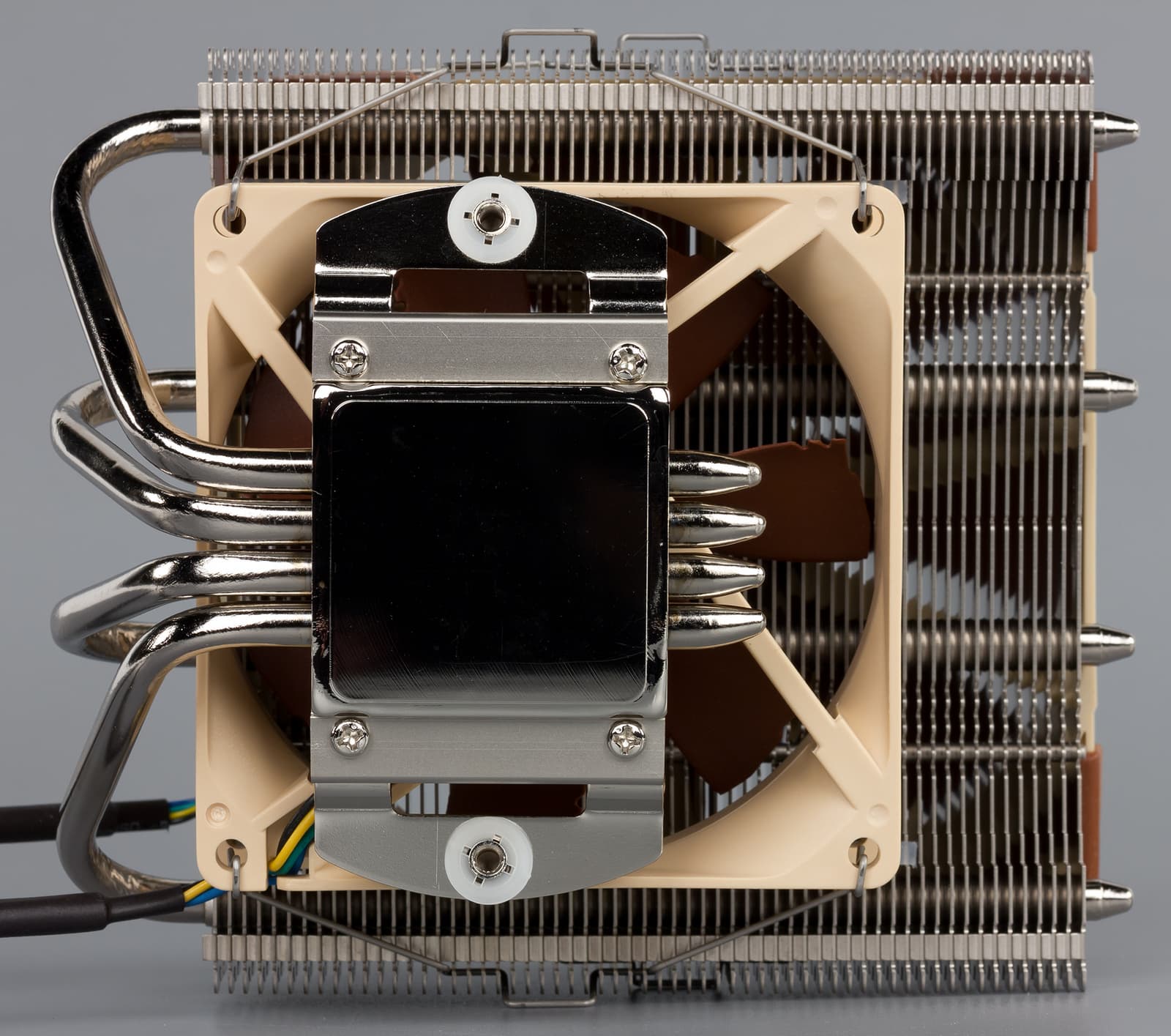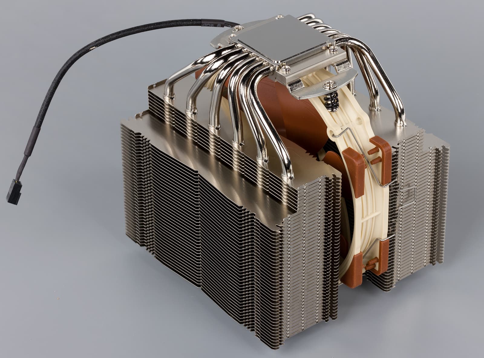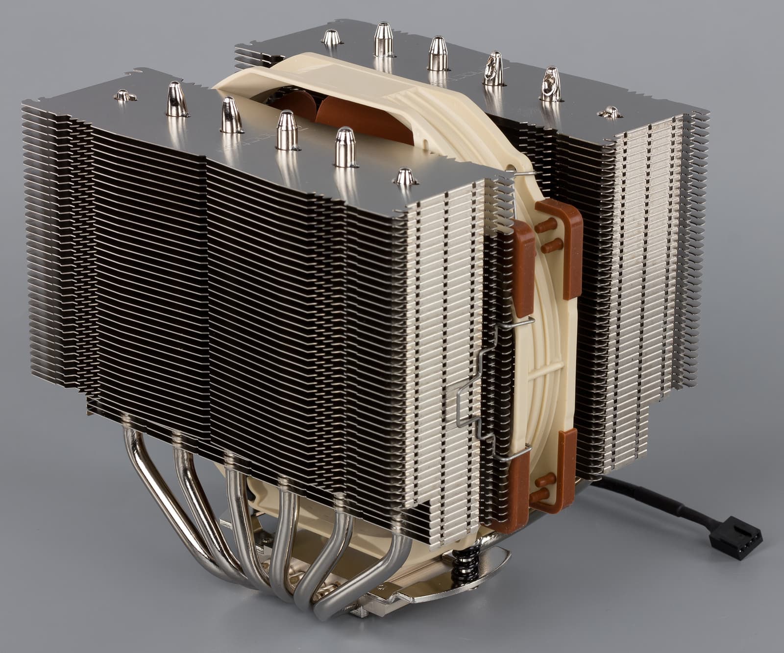 Радиатор представляет собой практически точную копию конструкции, которая применяется в кулере Noctua NH-D15. Однако если форма радиаторных ребер осталась прежней, то конфигурация тепловых трубок несколько изменена: здесь используются четыре 6-миллиметровые тепловые трубки вместо шести. Всего радиатор насчитывает 70 пластин, по 35 в каждой секции, расположенных с зазором 1,8 мм. Для предотвращения вибрации в нижней части одной из секций имеются резиновые прокладки.