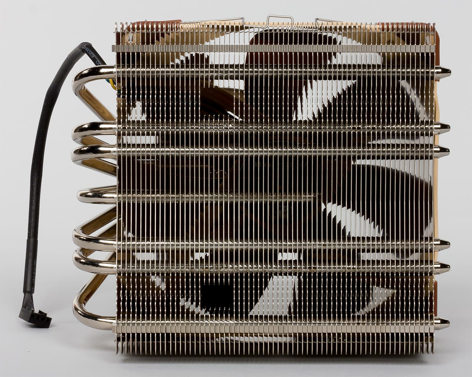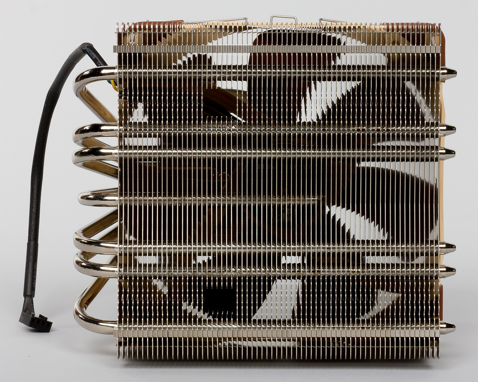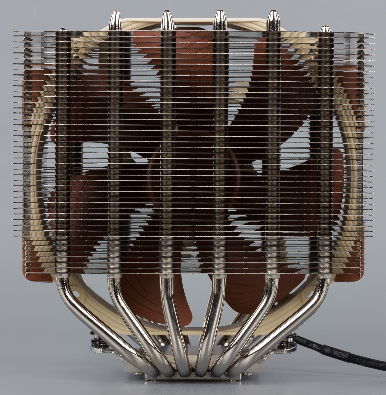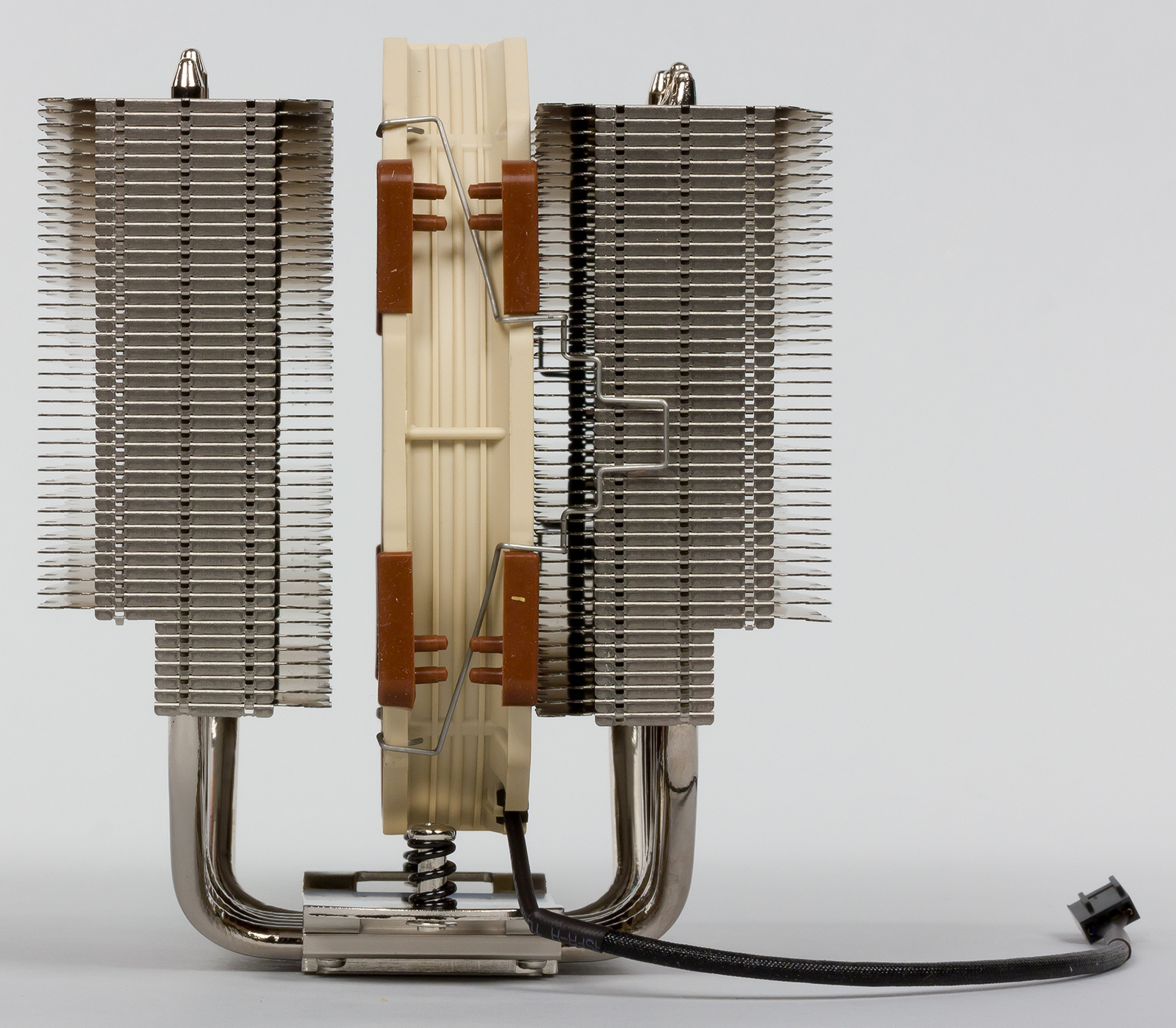 Радиатор представляет собой практически точную копию конструкции, которая применяется в кулере Noctua NH-D15. Однако если форма радиаторных ребер осталась прежней, то конфигурация тепловых трубок несколько изменена: здесь используются четыре 6-миллиметровые тепловые трубки вместо шести. Всего радиатор насчитывает 70 пластин, по 35 в каждой секции, расположенных с зазором 1,8 мм. Для предотвращения вибрации в нижней части одной из секций имеются резиновые прокладки.