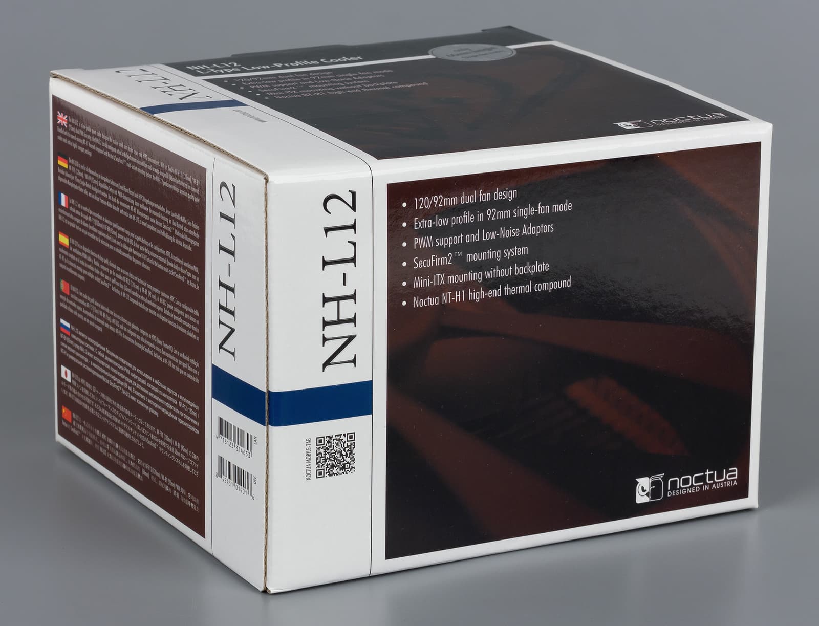 Noctua NH-L12 поставляется в фирменной упаковке, которая имеет нескромные габариты. Упаковка выполнена в привычных для Noctua темно-коричневых цветах. На сторонах коробки можно найти различную информацию: перечислены технические характеристики, основные особенности модели, ее размеры и пр. На верхней части упаковки можно увидеть круглую серебристую наклейку с числом 66 — высотой кулера в миллиметрах.