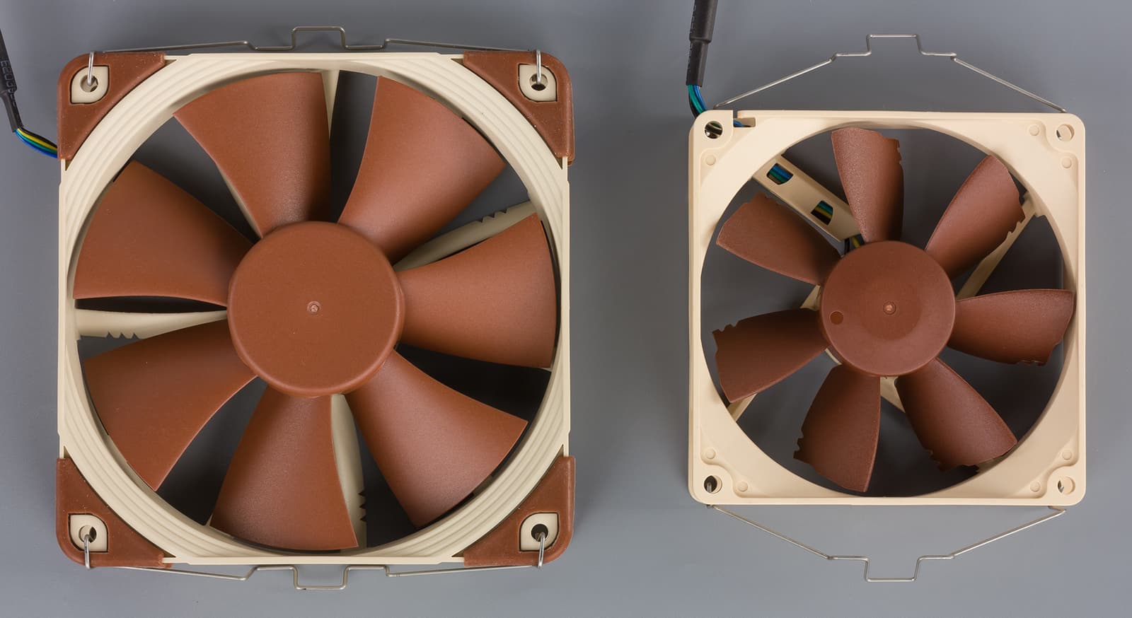 В этой модели используются вентиляторы Noctua NF-A15 PWM с габаритными размерами 140×150×25 мм. Эти вентиляторы построены по технологии SSO2, то есть основаны на все том же гидродинамическом подшипнике с магнитной стабилизацией и увеличенным сроком службы. Их отличает низкий уровень шума при работе, а также относительно небольшой диапазон скоростей вращения — от 300 до 1200 об/мин (900 об/мин в случае использования адаптера LNA). Согласно спецификации, этот тип вентиляторов создает максимальный воздушный поток 115,5 м³/ч (88,7 м³/ч с понижающим адаптером NA-RC7), а уровень шума составляет 19,2 (13,8) дБА. В комплект поставки входят два одинаковых вентилятора, так что их характеристики идентичны. Оба имеют 4-контактный разъем для подключения к системной плате и поддерживают ШИМ-управление. Подключение к материнской плате можно осуществить через специальный Y-разветвитель, который идет в комплекте с системой охлаждения. Рамки вентиляторов (в широкой части) оснащены резиновыми накладками для нейтрализации вибрации.
