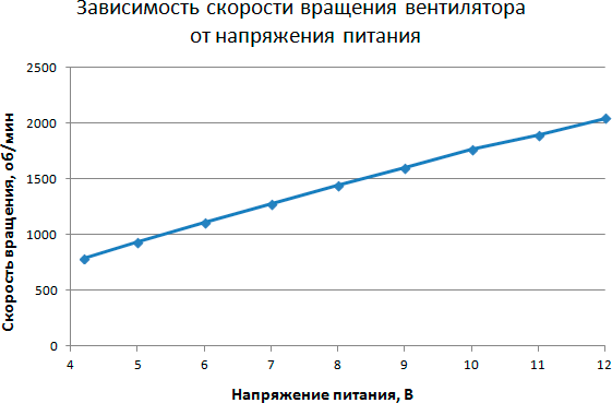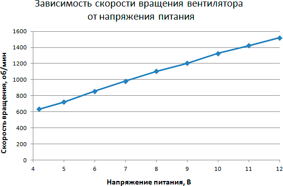 Вентилятор этой модели начинает свое вращение при 4,2 В, в то время как остановка его происходит при понижении напряжения до 4 В. Разница составляет чуть меньше 0,2 В и это очень хороший показатель.