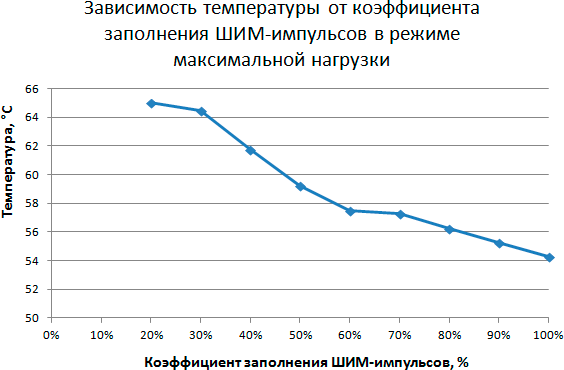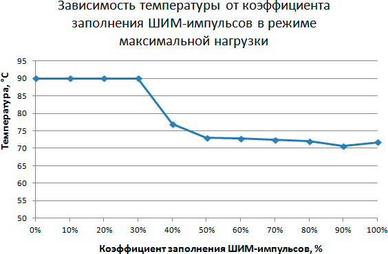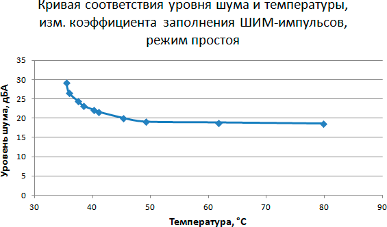 При управлении кулером с помощью ШИМ-контроллера, в этом тесте мы видим что при коэффициенте заполнения менее 30% температура начинает достаточно резко ползти вверх даже в режиме простоя. То есть, несмотря на возможность получить очень низкие обороты, кулер не сможет справиться с поставленной задачей, и из-за слишком низких оборотов вентилятора и небольшой площади рассеивания данная модель кулера начинает испытывать трудности и склонность к перегреву.