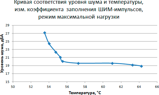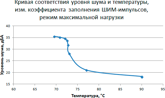 Кривые соответствия уровня шума и температуры для режима максимальной нагрузки достаточно показательны. Несмотря на низкий уровень шума при малых оборотах, кулер уже не справляется со своей задачей.