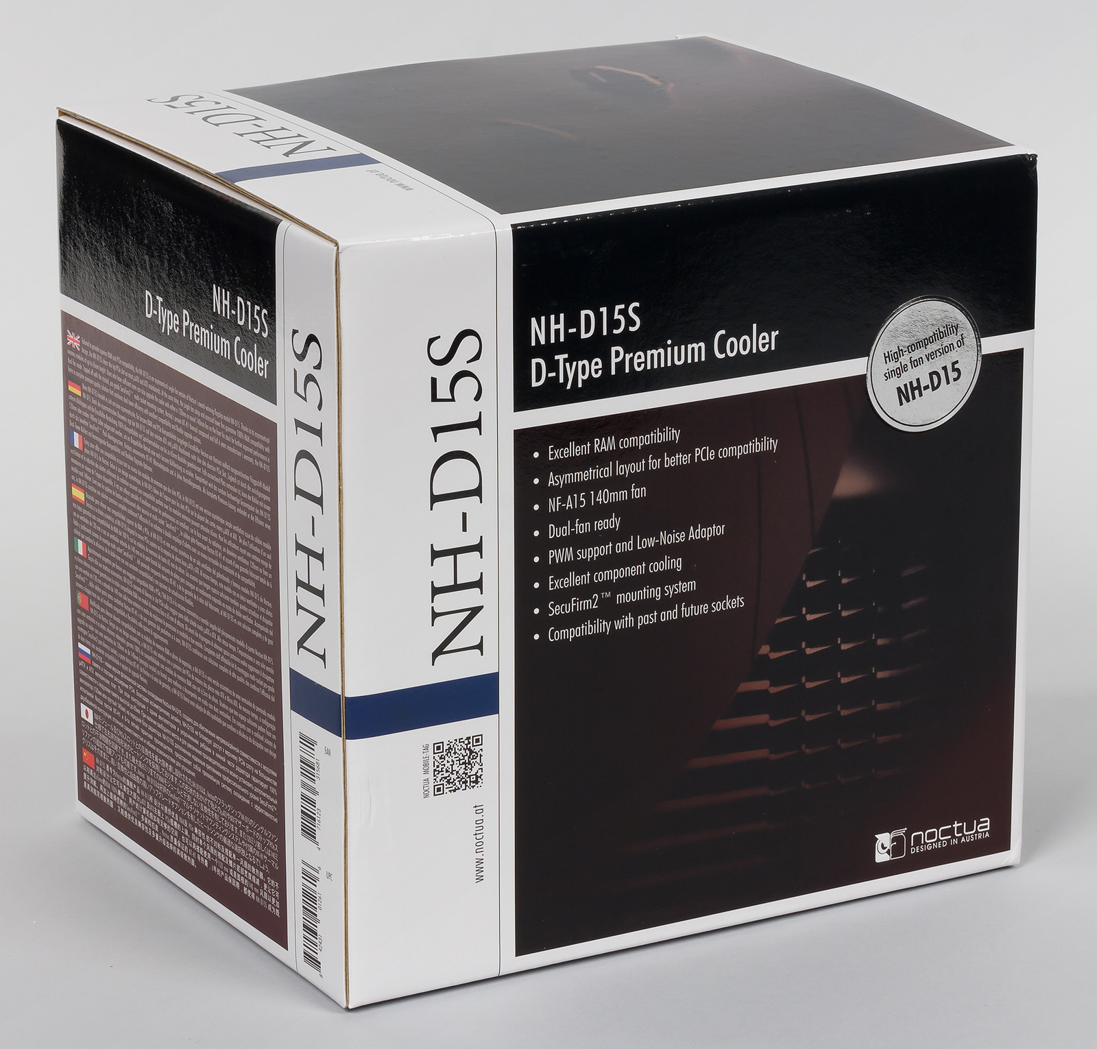 Упаковка Noctua NH-D15S практически не отличается от Noctua NH-D15, а в серебристом кружке даже есть отсылка к флагманской модели: «High-compatibility version of NH-D15» («версия NH-D15 с улучшенной совместимостью»).