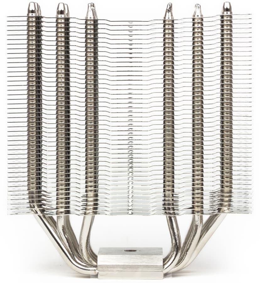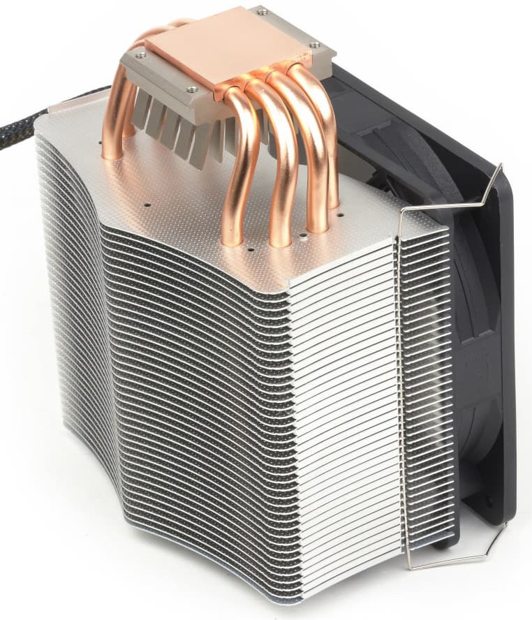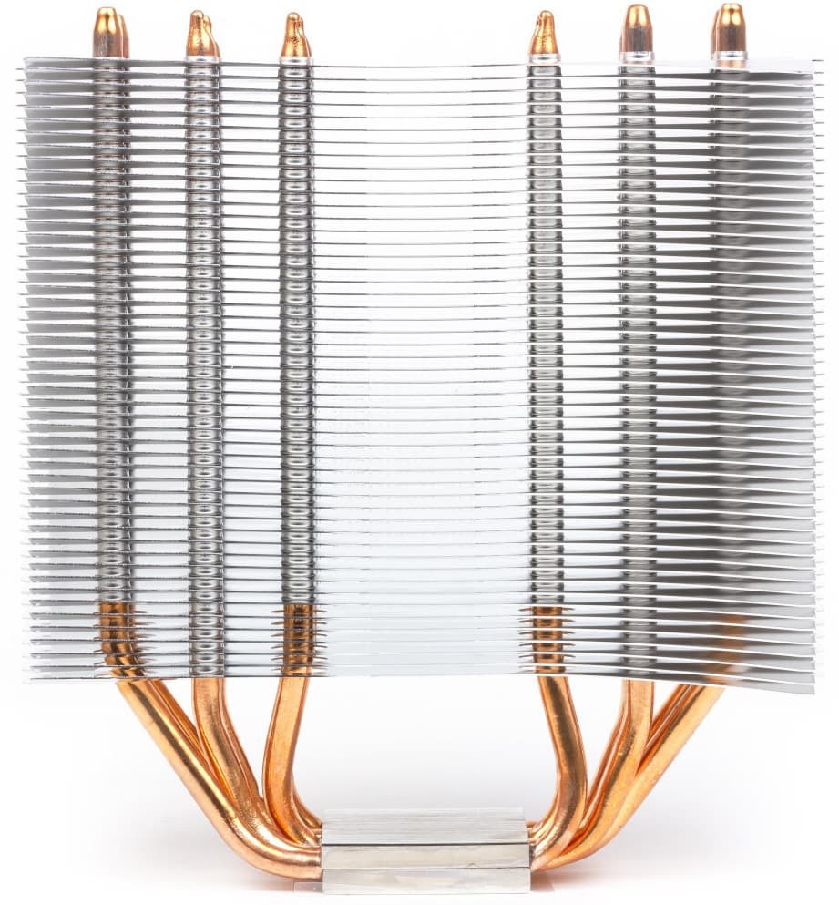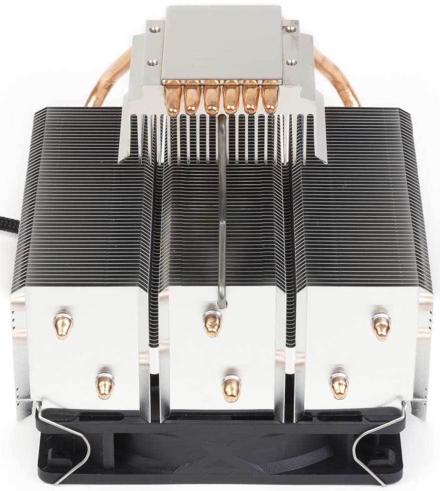 Шесть тепловых трубок передают тепло от никелированного медного основания радиатору, состоящему из алюминиевых ребер. Ребра очень тонкие (около 0,15 мм), расположены на расстоянии 2 мм.