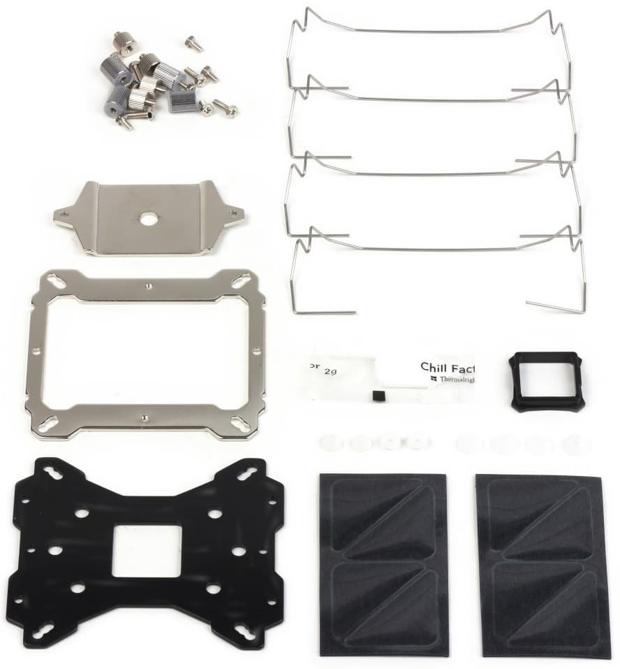 В комплекте помимо стандартного набора элементов крепежа, рассчитанного на все актуальные в настоящее время процессорные разъемы, имеется переходник-ограничитель частоты вращения вентилятора. При его использовании обороты снижаются более чем вдвое.