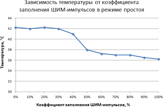 Как видно, в режиме максимальной нагрузки, графики сильно отличаются. Здесь также стоит отметить предпочтительное использование режима управления с помощью широтно-импульсной модуляции, так как при низких оборотах температура стремится к критической.